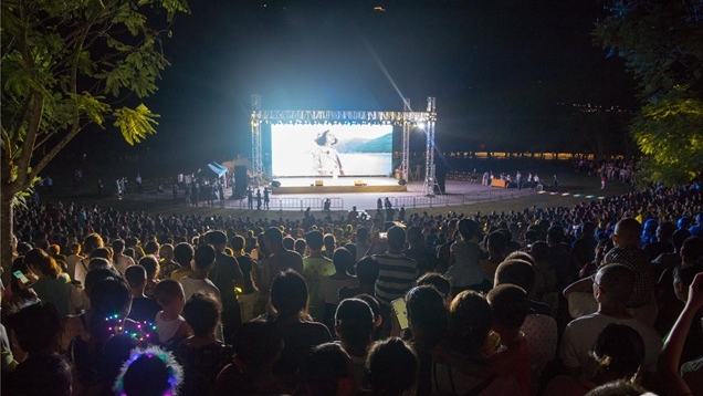 在月光劇場露天影院,播放著經典愛國電影《我和我的祖國》《攀登者》等,天剛擦黑,現場就已經座無虛席。大家認真觀看,如臨其境,時而深深地被影片吸引,時而互相討論著故事情節,感嘆影片中角色的不易和堅持,其角色勇往直前、奮不顧身、頑強不屈的精神讓現場觀眾深深震撼,其展現出來的愛國情懷、民族精神深深感染著在場的每一位觀眾。