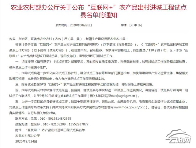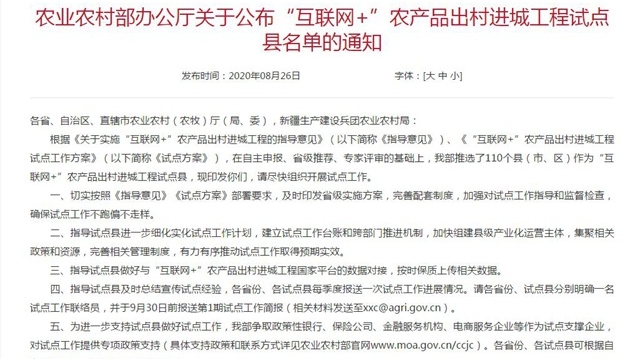 目前,根據相關要求,在自主申報、省級推薦、專家評審的基礎上,農業農村部推選了110個縣(市、區)作為“互聯網+”農產品出村進城工程試點縣,要求盡快組織開展“互聯網+”農產品出村進城工程試點縣試點工作。