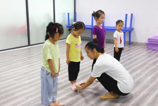 輔導老師手把手地糾正著小朋友的形體站姿