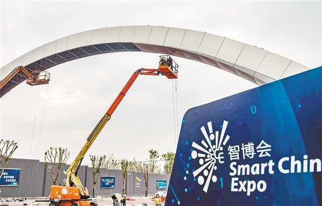 9月8日,在禮嘉智慧公園,工作人員正在布置場(chǎng)館。2020線上中國(guó)國(guó)際智能產(chǎn)業(yè)博覽會(huì)將于9月15日開幕。記者 龍帆 羅斌 攝/視覺重慶