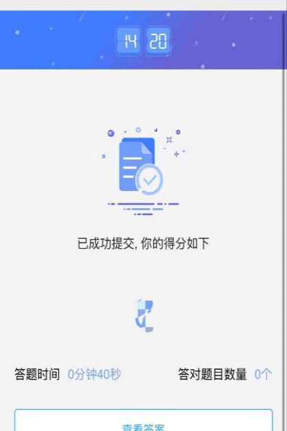 答題完成后,點(diǎn)擊提交答案,系統(tǒng)自動(dòng)顯示答題分?jǐn)?shù)、答題時(shí)間、答對(duì)題目數(shù)量、查看答案、查看排行等。