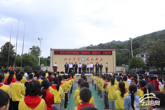 重慶溫州平陽商會會長黃克鎖在捐贈儀式上諄諄教導全體學生好好讀書,少年強則國強,努力奮斗,爭做有益于國家,有益于社會的新青年。