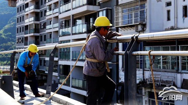 在一標段施工現場,記者看到,現場一片繁忙,高高聳立的塔吊在高空來回轉動,忙著建設材料的吊運;地面上,工人們忙著進行箱梁鋼筋綁扎、人行道鋪裝等。