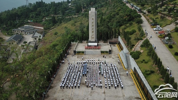 烈士陵園內,松柏長青,氣氛肅穆。革命烈士紀念碑巍然聳立,正中央“人民英雄永垂不朽”八個大字,熠熠生輝。紀念碑前,600多名社會各界代表手持鮮花,列隊肅立。隊列之前,以中共云陽縣委、縣人大常委會、縣人民政府、縣政協,駐云各部隊,各民主黨派、工商聯和無黨派人士,各人民團體和各界群眾,軍烈屬和老戰士,全縣少先隊員名義敬獻的9個大型花籃一字排開,寄托著社會各界對英烈的深切緬懷。