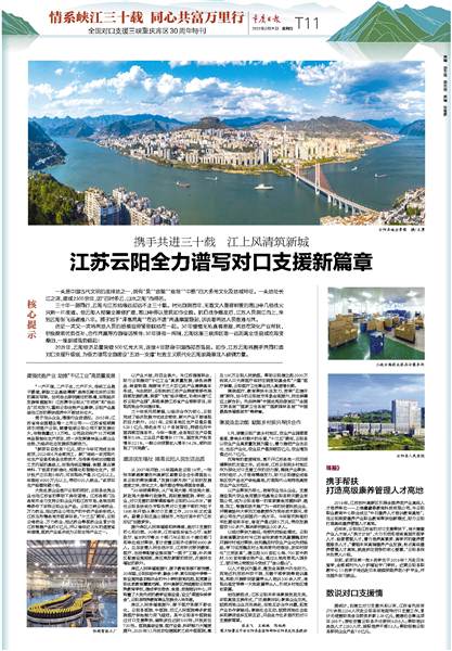 2021年,云陽經濟總量突破500億元大關,連續4年躋身中國西部百強縣。如今,江蘇云陽將攜手共同打造對口支援升級版,為奮力譜寫全面建設“五地一支撐”社會主義現代化云陽新篇章注入磅礴力量。
