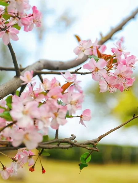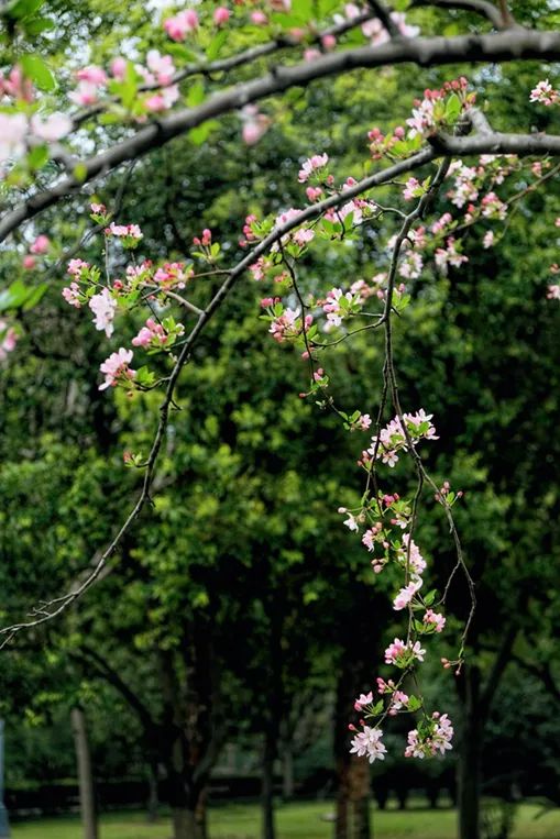 垂絲海棠亭亭玉立于芳草間