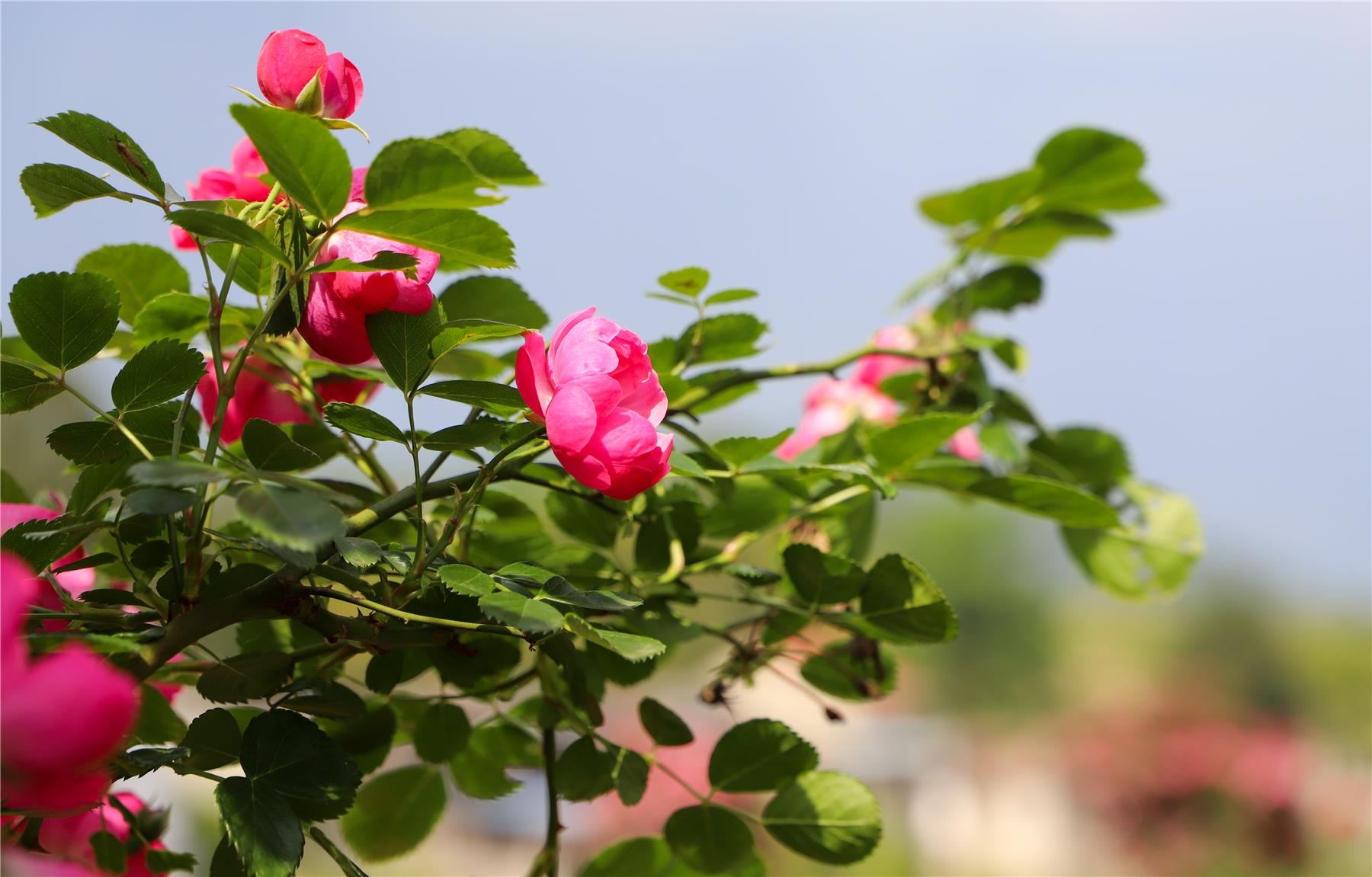 在吉慶村田園綜合體景區內,只見朵朵薔薇花開得正艷,微風拂過,好似一抹粉色的花海,大紅、粉紅的花朵在枝頭爭奇斗艷,綠葉蔥蘢,枝蔓垂掛,與藍天、白云、村舍相映成趣,小徑旁,一簇簇薔薇花隨風搖曳,美不勝收,吸引不少村民駐足觀賞、拍照留念。